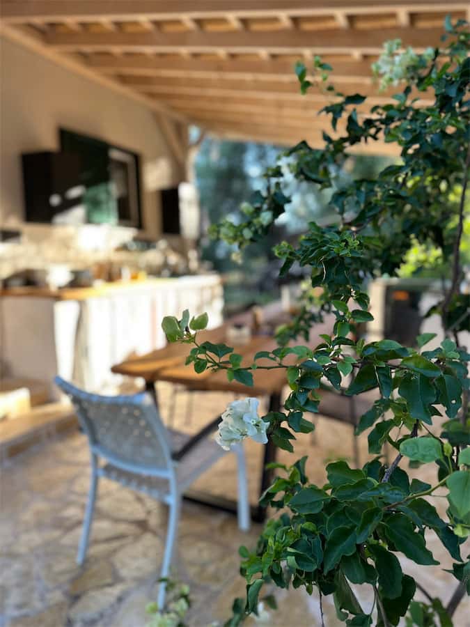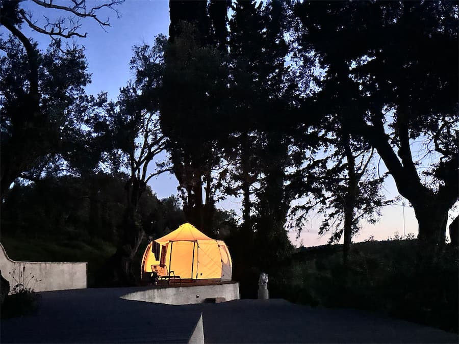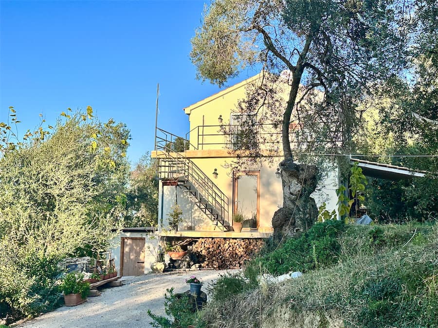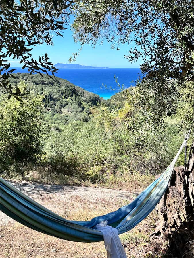 At the center of the property is a 180 sqm wooden platform on two levels that opens naturally to the sky, providing unobstructed views of the sea – west toward the sunset and north to the mountains of Albania. The property is gently sloped and completely secluded, surrounded by olive groves. In addition to a swing and slackline, it features a sauna, cold and solar showers, and dry-separation toilets. A fully equipped outdoor kitchen with gas stove, refrigerator, dishwasher, and filtered drinking water is also available.
